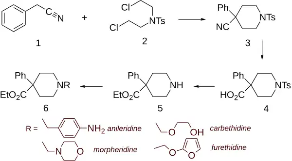 The key intermediate, normeperidine, is obtained by a scheme closely akin to the parent molecule. Thus, alkylation of benzyl cyanide (1) with the tosyl analog of the bischloroethylamine (2) leads to the substituted piperidine (3). Basic hydrolysis serves to convert the nitrile to the acid (4). Treatment of this last with sulfuric acid in ethanol serves both to esterify the acid and to remove the tosyl group to yield the secondary amine (5).