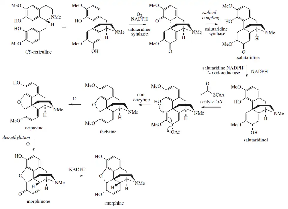 - ↑ Novak B, Hudlicky T, Reed J, Mulzer J, Trauner D (March 2000). "Morphine Synthesis and Biosynthesis-An Update" (PDF). Current Organic Chemistry. 4 (3): 343–362. CiteSeerX 10.1.1.515.9096. doi:10.2174/1385272003376292. Archived (PDF) from the original on 19 June 2012. Archived 19 June 2012 at the Wayback Machine