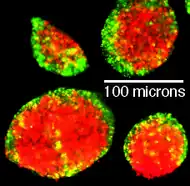 At a tissue level, ignoring the means of control, morphogenesis arises because of cellular proliferation and motility.[9] Morphogenesis also involves changes in the cellular structure[10] or how cells interact in tissues. These changes can result in tissue elongation, thinning, folding, invasion or separation of one tissue into distinct layers. The latter case is often referred as cell sorting. Cell "sorting out" consists of cells moving so as to sort into clusters that maximize contact between cells of the same type. The ability of cells to do this has been proposed to arise from differential cell adhesion by Malcolm Steinberg through his differential adhesion hypothesis. Tissue separation can also occur via more dramatic cellular differentiation events during which epithelial cells become mesenchymal (see Epithelial–mesenchymal transition). Mesenchymal cells typically leave the epithelial tissue as a consequence of changes in cell adhesive and contractile properties. Following epithelial-mesenchymal transition, cells can migrate away from an epithelium and then associate with other similar cells in a new location.[11] In plants, cellular morphogenesis is tightly linked to the chemical composition and the mechanical properties of the cell wall.[12][13]