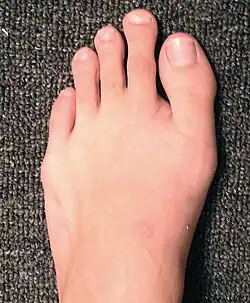 Morton's toe, also known as Greek toe, is the condition of having a first metatarsal bone that is shorter than the second metatarsal (see diagram). It is a type of brachymetatarsia.[1] This condition is the result of a premature closing of the first metatarsal's growth plate, resulting in a short big toe, giving the second toe the appearance of being long compared to the first toe.