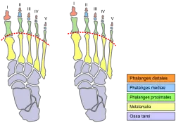 | Dorsal surface of a right foot with Morton's toe (left image) and without (right image). The dashed line highlights joint position. Metatarsals in yellow. | |