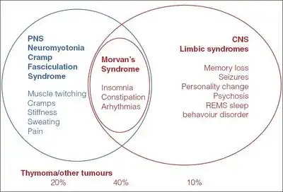 - ↑ 3.0 3.1 3.2 3.3 3.4 Cottrell, D A; K J Blackmore; P R W Fawcett; et al. (2004). "Sub-acute presentation of Morvan's syndrome after thymectomy". Journal of Neurology, Neurosurgery, and Psychiatry. 75 (10): 1504–1509. doi:10.1136/jnnp.2003.031401. PMC 1738744. PMID 15377711.