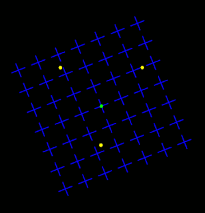 The illustrated version is a reproduction of an MIB display used by Michael Bach (2002).[3] Bach replaced the 3D swarm of blue dots with a flat, rotating matrix of blue crosses and added a central, green, flashing dot for people to keep their eyes on. This produces robust disappearances of the yellow dots.