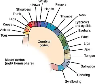 {{cite journal}}: CS1 maint: multiple names: authors list (link) - ↑ Meier, J.D., Aflalo, T.N., Kastner, S. and Graziano, M.S.A. (2008). "Complex organization of human primary motor cortex: A high-resolution fMRI study". J. Neurophysiol. 100 (4): 1800–1812. doi:10.1152/jn.90531.2008. PMC 2576195. PMID 18684903.