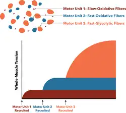 If a correlation were to be drawn between Henneman's size principle[14] and the motor unit categorization of Burke regarding the order of motor unit recruitment, it would resemble the following order: the smallest units, S (slow) (Slow-Oxidative), would be recruited first, followed by larger FR (fast, resistant) (Fast-Oxidative) units, and lastly the largest FF (fast, fatigable) (Fast-Glycolytic) units, reserved for high-energy tasks that require additional motor unit recruitment.[15][16]