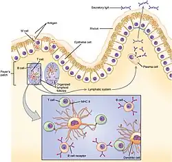 In the gut, lymphoid tissue is dispersed in gut-associated lymphoid tissue (GALT). A large number of immune system cells in the intestines are found in dome-like structures called Peyer's patches and in small mucosal lymphoid aggregates called crypto patches.[14] Above the Peyer's patches is a layer of epithelial cells, which together with the mucus form a barrier against microbial invasion into the underlying tissue. Antigen sampling is a key function of Peyer's patches. Above the Peyer's patches is a much thinner mucus layer that helps the antigen sampling.[14] Specialized phagocytic cells, called M cells, which are found in the epithelial layer of the Peyer's patches, can transport antigenic material across the intestinal barrier through the process of transcytosis.[15] The material transported in this way from the intestinal lumen can then be presented by the antigen-presenting cells present in Peyer's patches.[14][15] In addition, dendritic cells in Peyer's patches can extend their dendrites through M cell-specific transcellular pores and they can also capture translocated IgA immune complexes.[16] Dendritic cells then present the antigen to naïve T cells in the local mesenteric lymph nodes.[17]