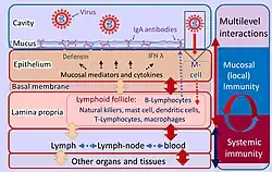 The mucosal immune system consists of a cellular component, humoral immunity, and defense mechanisms that prevent the invasion of microorganisms and harmful foreign substances into the body. These defense mechanisms can be divided into physical barriers (epithelial lining, mucus, cilia function, intestinal peristalsis, etc.) and chemical factors (pH, antimicrobial peptides, etc.).[3]