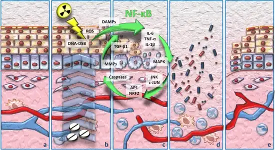- Primary damage response. Chemotherapy, radiotherapy and free radicals all contribute to the activation of transcription factors, such as NF-κB. This results in the upregulation of pro-inflammatory cytokines, ceramide, nitric oxide and matrix metalloproteinases. The consequence of this is mucosal destruction, caused by thinning of the epithelium due to tissue injury and cell death.
