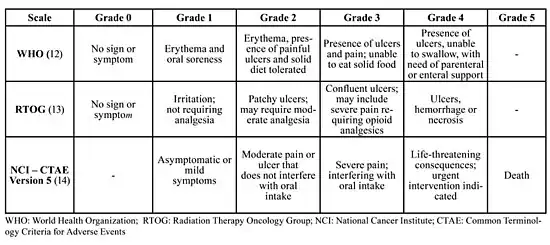 - ↑ Sonis, Stephen T.; Eilers, June P.; Epstein, Joel B.; Leveque, Francis G.; Liggett, William H.; Mulagha, Mary T.; Peterson, Douglas E.; Rose, Ann H.; Schubert, Mark M.; Spijkervet, Frederik K.; Wittes, Janet P. (1999). "Validation of a new scoring system for the assessment of clinical trial research of oral mucositis induced by radiation or chemotherapy". Cancer. 85 (10): 2103–13. doi:10.1002/(SICI)1097-0142(19990515)85:10<2103::AID-CNCR2>3.0.CO;2-0. PMID 10326686.