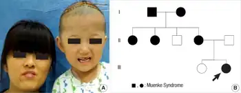 | a) The child and her mother with a Pro250Arg mutation in exon 7 (IgII-IGIII linker domain) of the FGFR3 gene. The mother also had mild midfacial hypoplasia, hypertelorism, and downslanting palpebral fissures. b) pedigree of the family with Muenke syndrome | |