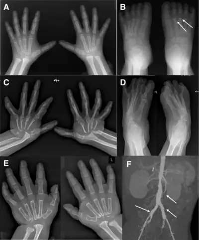 - ↑ 2.0 2.1 Shurtleff DB, Sparkes RS, Clawson DK, Guntheroth WG, Mottet NK (1964) Hereditary osteolysis with hypertension and nephropathy. JAMA 188:363–368