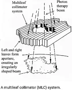 A multileaf collimator (MLC) is a collimator or beam-limiting device that is made of individual "leaves" of a high atomic numbered material, usually tungsten, that can move independently in and out of the path of a radiotherapy beam in order to shape it and vary its intensity.