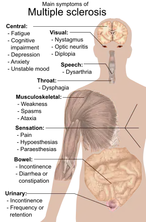 A person with MS can have almost any neurological symptom or sign, with autonomic, visual, motor, and sensory problems being the most common.[5] The specific symptoms are determined by the locations of the lesions within the nervous system, and may include loss of sensitivity or changes in sensation such as tingling, pins and needles or numbness, muscle weakness, blurred vision,[19] very pronounced reflexes, muscle spasms, or difficulty in moving; difficulties with coordination and balance (ataxia); problems with speech or swallowing, visual problems (nystagmus, optic neuritis or double vision), feeling tired, acute or chronic pain, and bladder and bowel difficulties (such as neurogenic bladder), among others.[5]