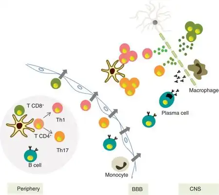 Apart from demyelination, the other sign of the disease is inflammation. Fitting with an immunological explanation, the inflammatory process is caused by T cells, a kind of lymphocyte that plays an important role in the body's defenses.[8] T cells gain entry into the brain via disruptions in the blood–brain barrier. The T cells recognize myelin as foreign and attack it, explaining why these cells are also called "autoreactive lymphocytes".[5]