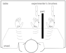 In the rubber hand illusion (RHI),[63] human participants view a dummy hand being stroked with a paintbrush, while they feel a series of identical brushstrokes applied to their own hand, which is hidden from view. If this visual and tactile information is applied synchronously, and if the visual appearance and position of the dummy hand is similar to one's own hand, then people may feel that the touches on their own hand are coming from the dummy hand, and even that the dummy hand is, in some way, their own hand.[63] This is an early form of body transfer illusion.