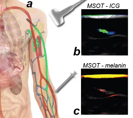 Melanoma metastasizes early into regional lymph nodes, so excision and analysis of so-called sentinel lymph nodes is important for treatment planning and prognosis assessment. To identify the sentinel lymph node for excision, a gamma-emitting radiotracer is injected inside the primary tumor and allowed to accumulate inside the sentinel lymph node. MSOT may provide a non-radioactive, non-invasive alternative for examination of the metastatic status of the sentinel lymph node. Initial studies have shown that MSOT can detect sentinel lymph nodes based on indocyanine green (ICG) accumulation after injection in the tumor, as well as melanoma metastasis inside the lymph nodes.[22]