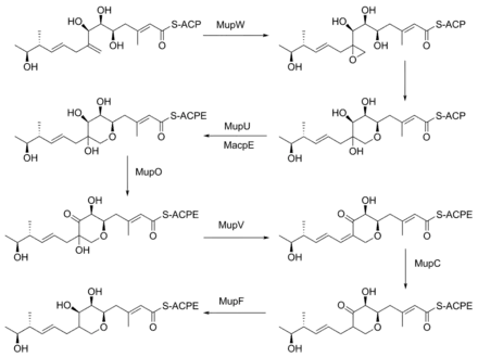 The formation of the pyran ring requires many enzyme-mediated steps (Figure 4). The double bond between C8 and C9 is proposed to migrate to between C8 and C16.[24] Gene knockout experiments of mupO, mupU, mupV, and macpE have eliminated PA-A production.[24] PA-B production is not removed by these knockouts, demonstrating that PA-B is not created by hydroxylating PA-A. A knockout of mupW eliminated the pyran ring, identifying MupW as being involved in ring formation.[24] It is not known whether this occurs before or after the esterification of monic acid to 9-hydroxy-nonanoic acid.