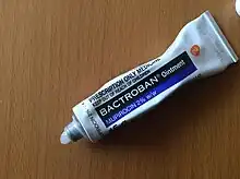Mupirocin, sold under the brand name Bactroban among others, is a topical antibiotic useful against superficial skin infections such as impetigo or folliculitis.[2][5] It may also be used to get rid of methicillin-resistant S. aureus (MRSA) when present in the nose without symptoms.[2] Due to concerns of developing resistance, use for greater than ten days is not recommended.[5] It is used as a cream or ointment applied to the skin.[2]