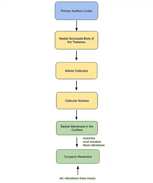 The general relationship of the association between emotion and music is that after the auditory sensory relay of the musical information to the primary auditory cortex (shown in figure 1), the hippocampal connection in the brain encodes the association of positive/negative emotions with certain music in the memory.[1] Given this memory, when a person receives musical information from the environment, the hippocampus relays the emotional information related to that music to the mesolimbic system, which regulates the association of emotion and dopamine release.[14]