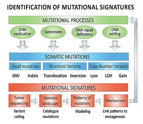 - ↑ Alexandrov LB, Nik-Zainal S, Wedge DC, Campbell PJ, Stratton MR (January 2013). "Deciphering signatures of mutational processes operative in human cancer". Cell Reports. 3 (1): 246–59. doi:10.1016/j.celrep.2012.12.008. PMC 3588146. PMID 23318258.