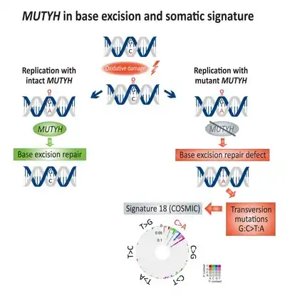 Somatic enrichment for transversion mutations (G:C>T:A) has been associated with base excision repair (BER) deficiency and linked to defective MUTYH, a DNA glycosylase, in colorectal cancer.[17] Direct DNA oxidation damage leads to the creation of 8-Oxoguanine, which if remains un-repaired, will lead to incorporation of adenine instead of cytosine during DNA replication. MUTYH encodes the mutY adenine glycosylase enzyme which excise the mismatched adenine from 8-Oxoguanine:adenine base pairing, therefore enabling DNA repair mechanisms involving OGG1 (Oxoguanine glycosylase) and NUDT1 (Nudix hydrolase 1, also known as MTH1, MutT homolog 1) to remove the damaged 8-Oxoguanine.[18]