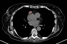 A chest CT-scan showing a thymoma (red circle)