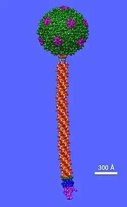 A mycobacteriophage is a member of a group of bacteriophages known to have mycobacteria as host bacterial species. While originally isolated from the bacterial species Mycobacterium smegmatis and Mycobacterium tuberculosis,[2] the causative agent of tuberculosis, more than 4,200 mycobacteriophage species have since been isolated from various environmental and clinical sources. 2,042 have been completely sequenced.[3] Mycobacteriophages have served as examples of viral lysogeny and of the divergent morphology and genetic arrangement characteristic of many phage types.[4]