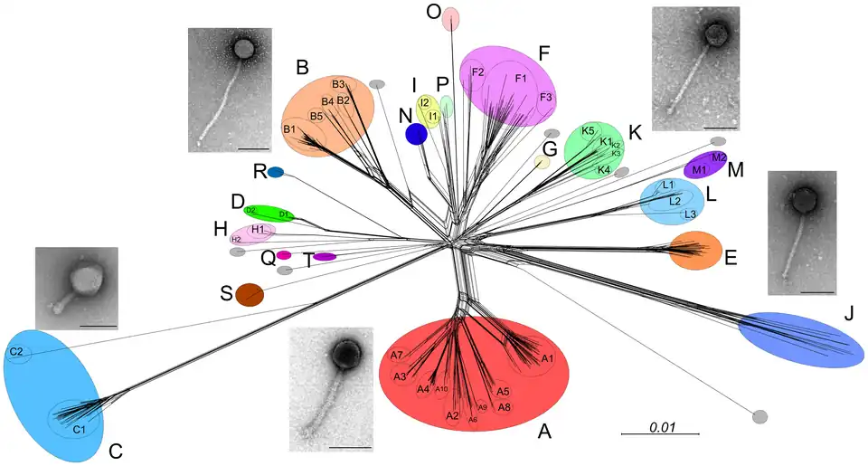 Thousands of mycobacteriophage have been isolated using a single host strain, Mycobacterium smegmatis mc2155, over 1400 of which have been completely sequenced.[3] These are mostly from environmental samples, but mycobacteriophages have also been isolated from stool samples of tuberculosis patients,[8] although these have yet to be sequenced.[9] About 30 distinct types (called clusters, or singletons if they have no relatives) that share little nucleotide sequence similarity have been identified. Many of the clusters span sufficient diversity that the genomes warrant division into subclusters (Figure 1).[9]