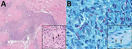 - ↑ 5.0 5.1 5.2 Han XY, Sizer KC, Thompson EJ, Kabanja J, Li J, Hu P, et al. (October 2009). "Comparative sequence analysis of Mycobacterium leprae and the new leprosy-causing Mycobacterium lepromatosis". Journal of Bacteriology. 191 (19): 6067–6074. doi:10.1128/JB.00762-09. PMC 2747882. PMID 19633074.