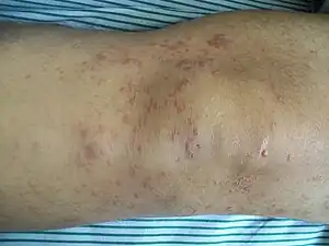 Itching (pruritus) is common, perhaps in 20 percent of patients. The symptoms displayed are progressive, with early stages consisting of lesions presented as scaly patches. Lesions often initially develop on the trunk of the body in places that are rarely exposed to the sun, such as the buttocks.[3] The advanced stage of mycosis fungoides is characterized by generalized erythroderma (red rash covering most of the body) with severe pruritus (itching) and scaling.[5] The key difference between Sézary syndrome and the other stages of mycosis fungoides is the large number of cancer cells found in the blood (leukemic disease).[7] When mycosis fungoides develops to meet the criteria for Sézary syndrome, it is referred to as leukemic mycosis fungoides, Sézary syndrome preceded by mycosis fungoides, or secondary mycosis fungoides.[7]