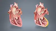 Myocardial rupture is most common three to seven days after myocardial infarction, commonly of small degree, but may occur one day to three weeks later. In the modern era of early revascularization and intensive pharmacotherapy as treatment for MI, the incidence of myocardial rupture is about 1% of all MIs.[6] This may occur in the free walls of the ventricles, the septum between them, the papillary muscles, or less commonly the atria. Rupture occurs because of increased pressure against the weakened walls of the heart chambers due to heart muscle that cannot pump blood out effectively. The weakness may also lead to ventricular aneurysm, a localized dilation or ballooning of the heart chamber.