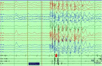 | Ictal EEG with polygraphy of a myoclonic–atonic seizure shows initial myoclonus associated with the burst of polyspikes and atonia on the EMG associated with slow wave component of the discharge | |