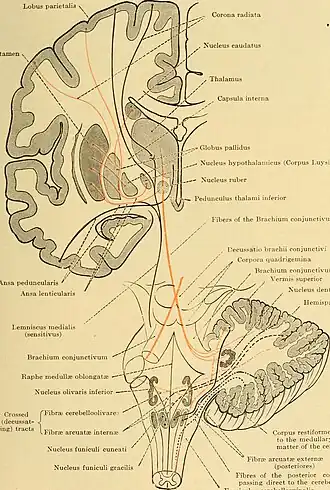 - ↑ Khoyratty, Fadil; Wilson, Thomas (2013). "The Dentato-Rubro-Olivary Tract: Clinical Dimension of This Anatomical Pathway". Case Reports in Otolaryngology. 2013 934386. doi:10.1155/2013/934386. ISSN 2090-6765. PMC 3639700. PMID 23662232.