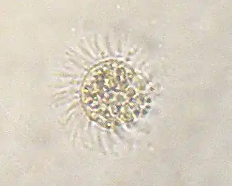M. rubrum is a free-living marine ciliate. It is reddish in colour and form dark-red mass during blooming. Its body is almost spherical, looking like a miniature sunflower with its radiating hair-like cilia on its body surface. It measures up to 100 μm in length and 75 μm in width. The body is superficially divided into two lobes due to formation of a constriction at the centre. The constriction gives rise to a larger anterior lobe and a smaller posterior lobe. The cilia arise from the constriction. Using the cilia it can jump about 10-20 times its body length in one movement.[10] Its nucleus is prominently situated at the centre, and is surrounded by organelles mostly derived from algae. For example, its cytoplasm contains numerous plastids, mitochondria and other nuclei. These organelles are properly separated such that the mitochondria are fully enclosed in a vacuole membrane and two endoplasmic reticulum membranes of the ciliate.[6] This indicates that the ciliate is primarily a heterotroph, but after acquiring algal plastid, it transforms into an autotroph.
