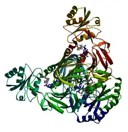 NAD+ kinase (EC 2.7.1.23, NADK) is an enzyme that converts nicotinamide adenine dinucleotide (NAD+) into NADP+ through phosphorylating the NAD+ coenzyme.[6] NADP+ is an essential coenzyme that is reduced to NADPH primarily by the pentose phosphate pathway to provide reducing power in biosynthetic processes such as fatty acid biosynthesis and nucleotide synthesis.[7] The structure of the NADK from the archaeanArchaeoglobus fulgidus has been determined.[1]