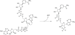 NADK phosphorylates NAD+ at the 2’ position of the ribose ring that carries the adenine moiety. It is highly selective for its substrates, NAD and ATP, and does not tolerate modifications either to the phosphoryl acceptor, NAD, or the pyridine moiety of the phosphoryl donor, ATP.[8] NADK also uses metal ions to coordinate the ATP in the active site. In vitro studies with various divalent metal ions have shown that zinc and manganese are preferred over magnesium, while copper and nickel are not accepted by the enzyme at all.[8] A proposed mechanism involves the 2' alcohol oxygen acting as a nucleophile to attack the gamma-phosphoryl of ATP, releasing ADP.