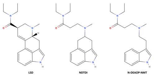 LSD (left), NDTDI (center), and N-DEAOP-NMT (right) chemical structures.