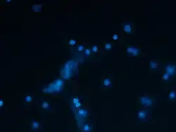 Fluorescent image of cultivated neutrophils isolated from venous blood of human with Alzheimer Disease. Sample was treated with Hoechst 33342 dye that is used to stain DNA. The picture shows the release of DNA by a neutrophil as foggy area in the center of the view field indicating the spontaneous activation of neutrophil extracellular traps (NETs) formation in AD patients that is not usually observed in healthy mates. Magnification x40.