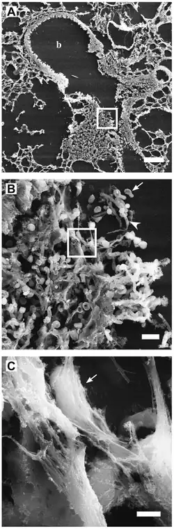 A scanning electron microscope image of NETs engulfing fungal cells (Candida albicans) in an infected mouse lung. (Click on image for more details.)[1]