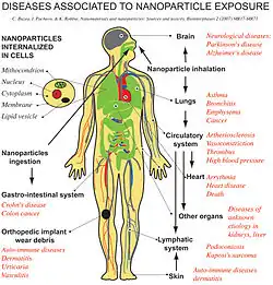 - ↑ Sukhanova, Alyona; Bozrova, Svetlana; Sokolov, Pavel; Berestovoy, Mikhail; Karaulov, Alexander; Nabiev, Igor (2018-02-07). "Dependence of Nanoparticle Toxicity on Their Physical and Chemical Properties". Nanoscale Research Letters. 13 (1): 44. Bibcode:2018NRL....13...44S. doi:10.1186/s11671-018-2457-x. ISSN 1556-276X. PMC 5803171. PMID 29417375.
