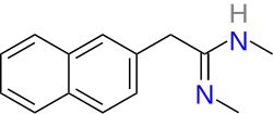 Reaction of N-methyl-2-(naphthalen-2-yl)acetamide [2086-65-9] (1) with triethyloxonium fluoroborate (Meerwein reagent) [368-39-8] (2) affords the corresponding imino ether (3). Exposure of this intermediate to methylamine (4) leads to napactidine (5).