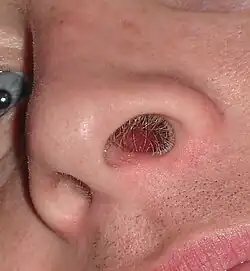 Nasal hair or nose hair is the hair in the nostril. Adult human noses have hairs, which serve as a crude air filter to stop foreign particles from entering the nasal cavity, as well as to help collect moisture.[1] Nasal hair is different from the cilia of the ciliated lining of the nasal cavity. These cilia are microtubule-based structures that are found in the respiratory tract, involved in the mucociliary clearance mechanism.