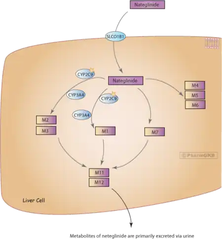 - ↑ "Anti-diabetic Drug Nateglinide Pathway, Pharmacokinetics". PharmGKB.