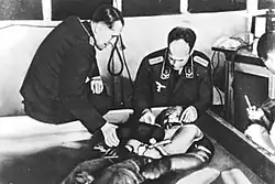 The freezing and hypothermia experiments were conducted for the Nazi high command to simulate the conditions the armies suffered on the Eastern Front, as the German forces were ill-prepared for the cold weather they encountered. Many experiments were conducted on captured Soviet troops; the Nazis wondered whether their genetics gave them superior resistance to cold. The principal locales were Dachau and Auschwitz. Sigmund Rascher, an SS doctor based at Dachau, reported directly to Reichsführer-SS Heinrich Himmler and publicised the results of his freezing experiments at the 1942 medical conference entitled "Medical Problems Arising from Sea and Winter".[18] Himmler suggested that the victims could be warmed by forcing them to engage in sexual contact with other victims. An example included how a hypothermic victim was placed between two naked Romani women.[19][20]