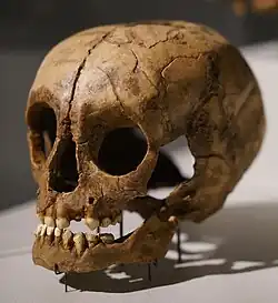 In 1995, Trinkaus estimated that about 80% succumbed to their injuries and died before reaching 40, and thus theorised that Neanderthals employed a risky hunting strategy ("rodeo rider" hypothesis).[75] Compared to contemporary modern humans, the rates of cranial trauma are not significantly different (although Neanderthals seem to have had a higher mortality risk),[76] there are few specimens of both Cro-Magnons and Neanderthals who died after the age of 40,[77] and there are overall similar injury patterns between them. In 2012, Trinkaus concluded that Neanderthals may have additionally been injuring themselves in the same way as contemporary humans, such as by interpersonal violence.[78]