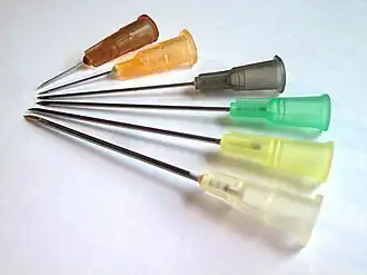 - ↑ "Hypodermic Needle Gauge Chart". Medical Tube Technology, Inc. Archived from the original on 10 October 2004. Retrieved 20 March 2012.