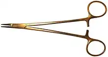 A needle holder, also called needle driver or needle forceps, is a surgical instrument similar to a hemostat, used by doctors and surgeons to hold and push a suturing needle when performing wound closure, ligation and other surgical procedures that require re-anastomosis.