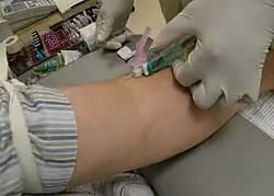 A needlestick injury is the penetration of the skin by a hypodermic needle or other sharp object that has been in contact with blood, tissue or other body fluids before the exposure.[1] Even though the acute physiological effects of a needlestick injury are generally negligible, these injuries can lead to transmission of blood-borne diseases, placing those exposed at increased risk of infection from disease-causing pathogens, such as the hepatitis B virus (HBV), hepatitis C virus (HCV), and human immunodeficiency virus (HIV). In healthcare and laboratory settings globally, there are over 25 distinct types of blood-borne diseases that can potentially be transmitted through needlestick injuries to workers.[2] In addition to needlestick injuries, transmission of these viruses can also occur as a result of contamination of the mucous membranes, such as those of the eyes, with blood or body fluids, but needlestick injuries make up more than 80% of all percutaneous exposure incidents in the United States.[1][3] Various other occupations are also at increased risk of needlestick injury, including law enforcement, laborers, tattoo artists, food preparers, and agricultural workers.[3][4]