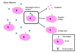 Immature B cells in the bone marrow undergo negative selection when they bind self peptides.[2]