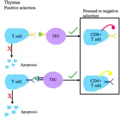 First, during "positive selection" the thymocytes are tested, whether their TCR works properly and those with unfunctional TCR are removed by apoptosis.[6][7] The mechanism has its name because it selects for survival only those thymocytes whose TCRs do interact with peptide-MHC complexes on antigen presenting cells in the thymus.